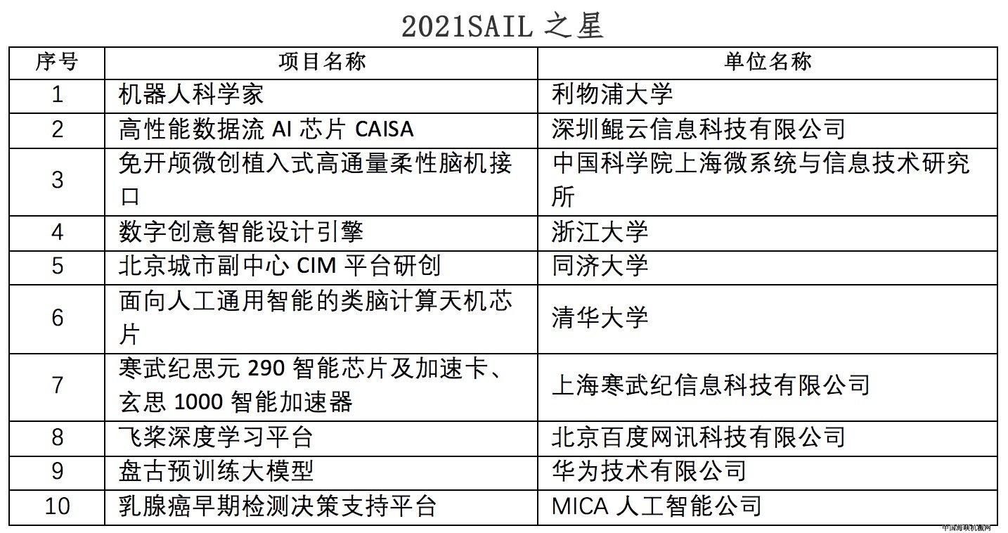 朱明杰、吴飞、卢策吾 论文《中国迈向新一代人工智能》2021年,SAIL奖新增设了SAIL之星,以鼓励更多的人工智能优秀项目,获得SAIL之星的项目是:
