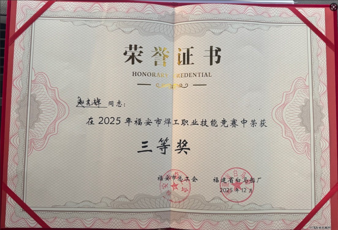 福宁重工代表队赵光辉凭借其精湛的技艺和扎实的理论基础,在众多参赛者中脱颖而出,荣获三等奖,充分展现新时代船政人的风采。这一荣誉不仅是对获奖选手技能的充分肯定,更是公司将百年船政的工匠基因融入现代制造的血脉,重视技能人才培育、强化团队建设的成效彰显。未来,福宁重工将持续支持员工参与各类职业技能赛事,深化“以赛促学、以赛促练”机制,不断提升员工技能素养,在新时代续写船政工匠精神的荣光,增强企业核心竞争力,为福建船政高质量发展注入强劲动力。