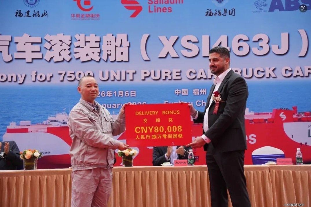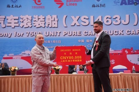 新年启新程,奋楫勇争先。1月6日,福建船政旗下马尾造船为Sallaum Lines建造的7500车LNG双燃料汽车滚装船(XSI463J)顺利交付,较合同期提前4个月,打响2026年首季“开门红”的奋进乐章。