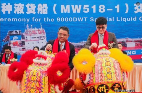 本次命名的9000DWT特种液货船(MW518-1)总长119.8米,设计航速13节,续航能力12000海里。船舶采用全新低阻力船体线型,搭配多重节能装置,能效与减排达行业先进水平,满足 IMO Tier III 氮氧化物排放标准。货舱经特殊设计,可安全承运沥青、闪点大于60℃的成品油、II 类化学品等多种液货,满足客户多样化需求。船舶还配备先进的航行与数智化监控系统,显著提升船舶的安全管控与运营效率,是一艘技术含量高、环保标准严的现代化特种船舶。