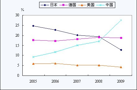2005~2009年日、德、美、中产值占世界总产值变化趋势