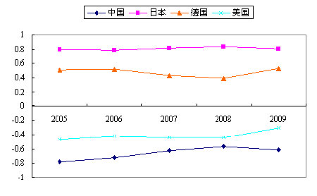 2005~2009年各国机床贸易竞争力指出变化趋势