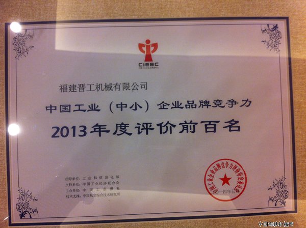 2014年5月24日,第十届中国工业论坛在北京顺利召开,晋工机械荣获中国工业中小企业品牌竞争力百强,排名第25位。
