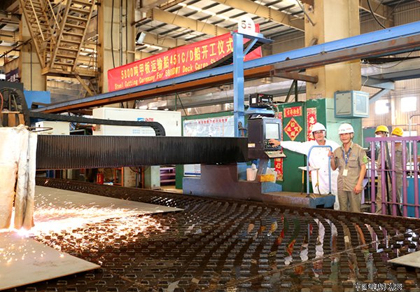 9时10分,LDPL公司驻厂经理洪先生在企业项目经理刘海镇的带领下来到等离子数控切割机台前,按下开工点火按钮,两艘5800吨甲板运输船(代码451C/D)正式开工建造。仪式后,嘉宾、领导们在开工现场合影留念。