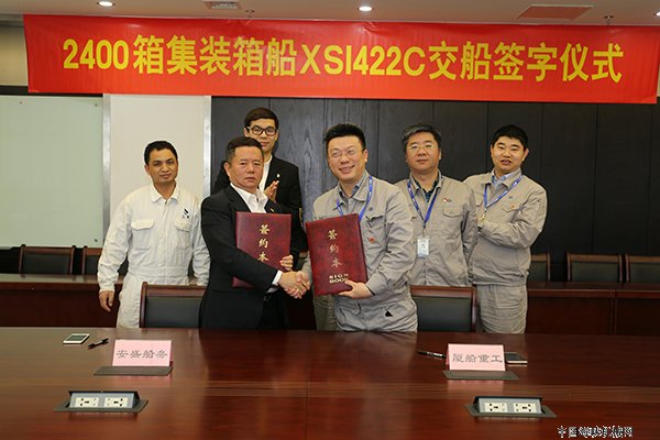 在之前的交船签字仪式上,泉州安盛船务有限公司高级顾问卢天赠和厦船重工董事长林勤分别在交船合同上签字。泉州安盛船务有限公司副主管徐楚翘,船东驻司监造项目经理李吉铨,厦船重工总经理章韬和公司相关人员出席并见证了仪式。