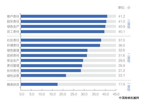 研究发现:2018年,中国汽车企业社会责任发展指数为34.1分,总体仍处于二星级(起步者)阶段。54家车企中五星级(卓越者)企业仅为3家,分别为现代汽车(中国)投资有限公司、东风汽车集团有限公司、中国第一汽车集团有限公司。仍有21家企业处于一星级(旁观者)阶段。