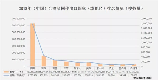 而在2018年(中国)台湾紧固件出口排名前十的国家(或地区)中,首次出现了墨西哥和西班牙,且表现不俗。