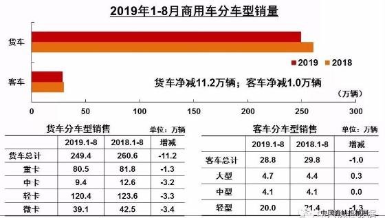 1-8月,商用车产销273万辆和278.2万辆,同比下降3.1%和4.2%。在商用车主要品种中,与上年同期相比,货车和客车产销均呈小幅下降。
