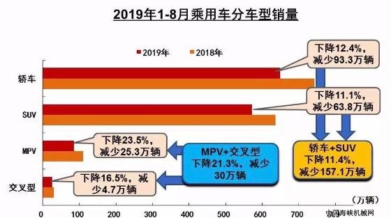 1-8月,乘用车产销1321万辆和1332.2万辆,同比下降13.8%和12.3%。在乘用车主要品种中,与上年同期相比,四大类品种产销依然呈一定下降,多功能乘用车(MPV)降幅更明显。