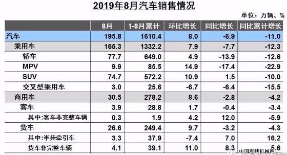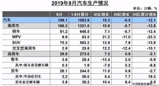 1-8月,汽车产销1593.9万辆和1610.4万辆,同比下降12.1%和11.0%,产销降幅比1-7月继续收窄。