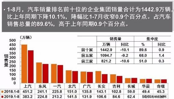 1-8月,汽车销量排名前十位的企业(集团)共销售1442.9万辆,占汽车销售总量的89.6%。在汽车销量排名前十位的企业中,与上年同期相比,长城和华晨销量继续保持小幅增长,其他八家企业均呈下降,其中长安、吉利和上汽降幅更为明显。
