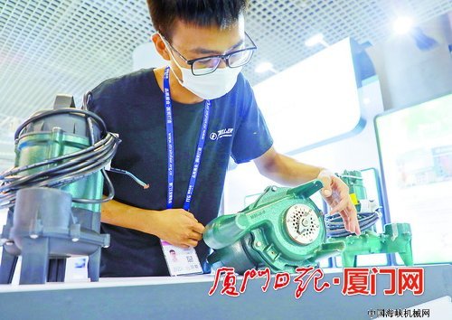 2020中国厦门国际水展上,卓勒水泵工作人员演示一台污水提升泵的运作。