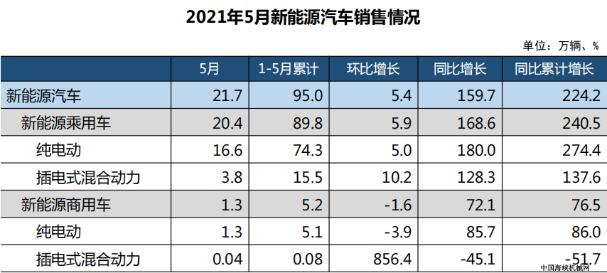 1-5月,新能源汽车产销双双超过90万辆,分别达到96.7万辆和95.0万辆,同比均增长2.2倍。在新能源汽车主要品种中,与上年同期相比,纯电动汽车和插电式混合动力汽车产销继续保持高速增长。