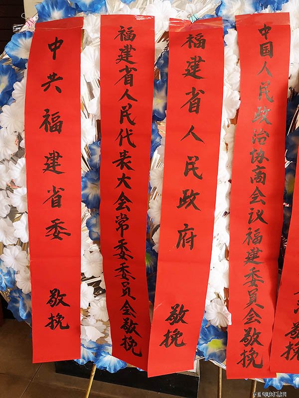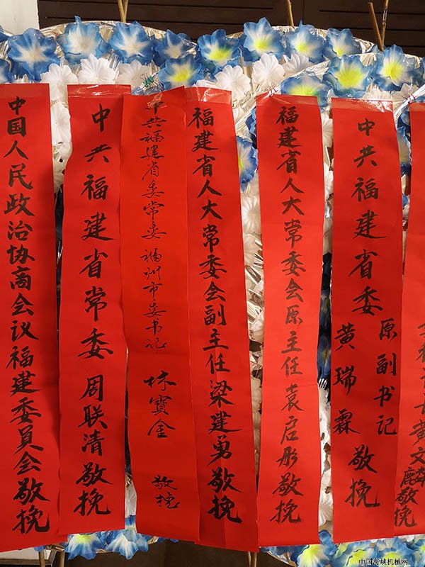 送花圈的还有福建省人民政府副秘书长、办公厅主任曹建平,福建省工业和信息化厅党组书记、厅长翁玉耀,华侨大学党委书记徐西鹏,省工信厅党组成员、副厅长陈传芳,原省机械工业厅厅长夏玉瑚,原省经信委副主任钟安平,原省机械工业厅副厅长陈庆友(巡视员)、刘秀基,厦门理工学院原院长陈文哲及贾成炳、张立波、谢作民、李清、刘小健、罗万荷、马士敏、董奕、孙宙锋、曾凡沛等;福建省企业与企业家联合会会长刘捷明、福建省机械工业联合会会长许振明、中国铸造行业协会、中国模具工业协会、中国工业报福建记者站以及安徽省、湖北省、湖南省、河南省、江苏省、无锡市、黑龙江省、陕西省、河北省、广西自治区、贵州省、山西省等12个省市的机械工业联合会和福建省市县相关行业协会、全省机械行业广大企业代表、亲朋好友、社会各届人士等也纷纷发来唁电、唁信并赠送挽联、敬献花圈。