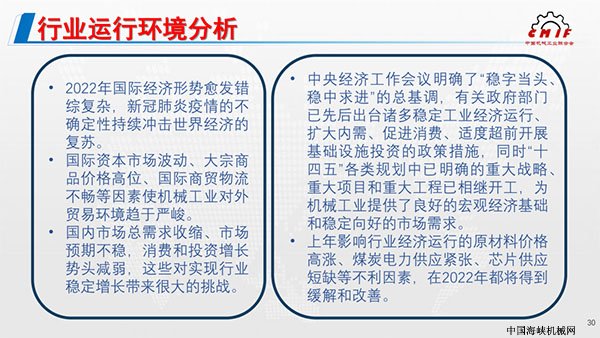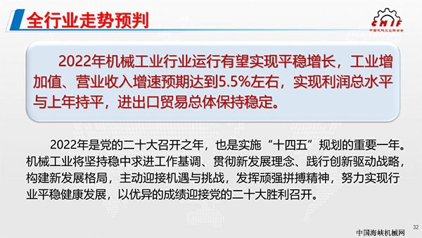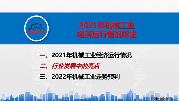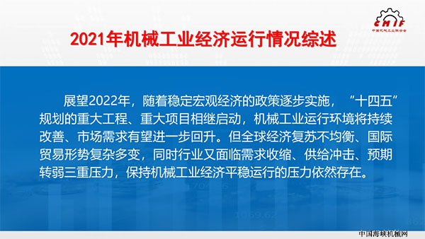 2022年2月22日,中国机械工业联合会2021全年机械工业经济运行形势信息发布会在京召开。中国机械工业联合会执行副会长陈斌发布2021全年机械工业经济运行形势信息,现将信息发布稿PPT刊登如下,供大家学习参考。
