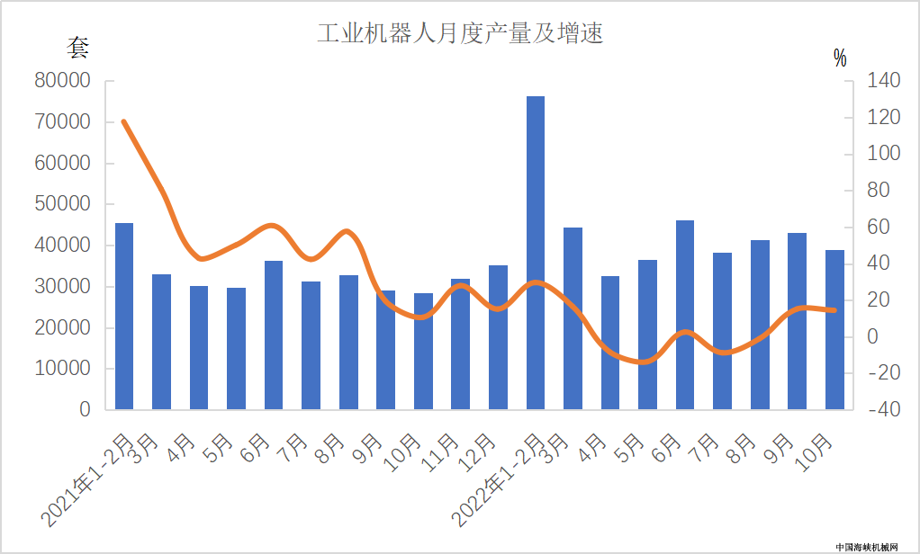 分行业看,1—10月份,机械工业涉及的主要大类行业中,通用设备制造业下降1.0%,专用设备制造业增长4.2%,汽车制造业增长8.1%,电气机械和器材制造业增长11.9%。 分产品看,1—10月份,金属切削机床47万台,下降12.5%;工业机器人362568套,下降3.2%;汽车2266.8万辆,增长8.1%,其中新能源汽车559万辆,增长108.4%;发电机组(发电设备)13850万千瓦,增长14.3%。(中国机械工业联合会统计信息部)