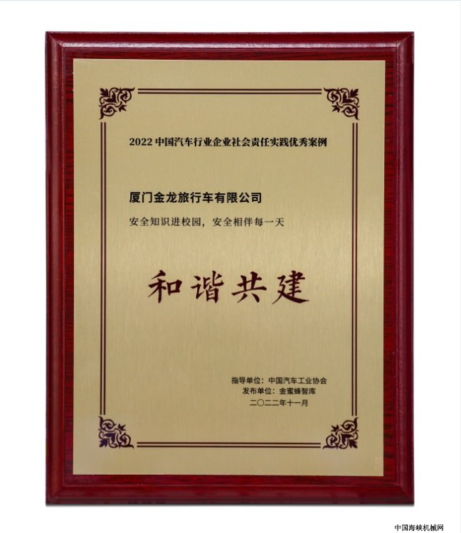 2022年11月8-10日,在中国汽车工业协会主办的“2022 中国汽车论坛”上,“绿色·责任·价值 推动汽车产业可持续发展”主题论坛发布了“2022 中国汽车行业企业社会责任实践优秀案例”,金旅客车“安全知识进校园,安全相伴每一天”案例荣获“和谐共建”奖。