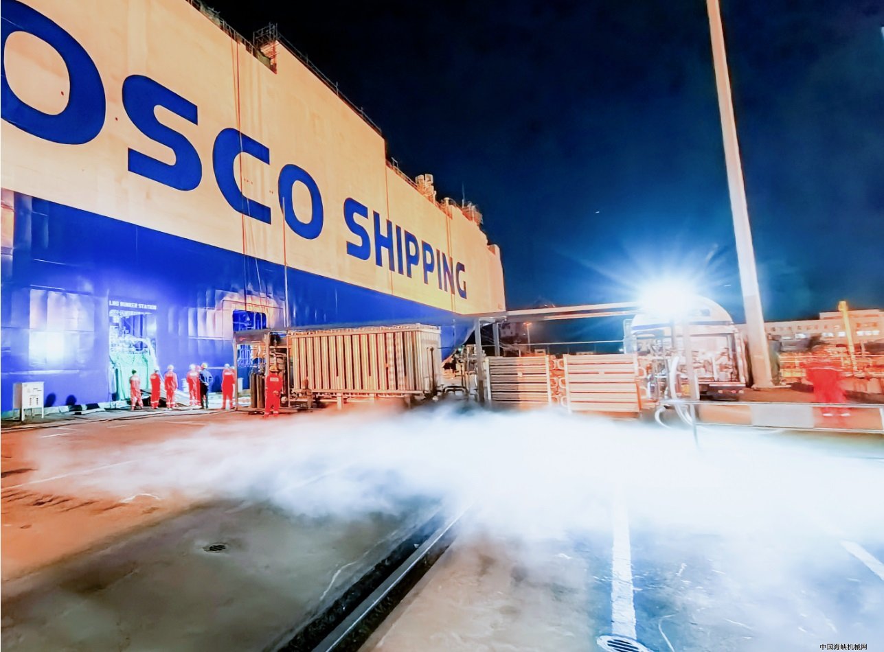 LNG作为船舶动力燃料,与传统船用燃油相比,可实现硫氧化物零排放、二氧化碳减排25%,尤其适合国际远洋船舶运能大、运距长的需求。全部采用液化天然气的模式下,续航能力达到了12000海里,比油的模式可达到减碳30%的效果。该船有两个LNG储罐,单罐重量约160吨,容量为1800立方,项目组提前做好关键区域状态检查及调试交验计划,与各相关部门、合作单位共同编制加注程序,制定风险防控措施及应急预案、现场处置方案等,同时明确参与人员职责分工,做好全面风险评估,对可能出现的各种风险事先预判,保障船舶具备加注条件。