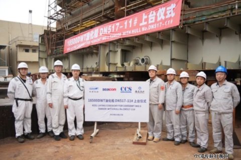继2艘18500DWT油化船(DN517-8/10)于10月25日下水、开工后,10月27日,18500DWT油化船(DN517-11)顺利上船台。